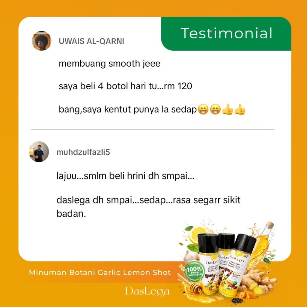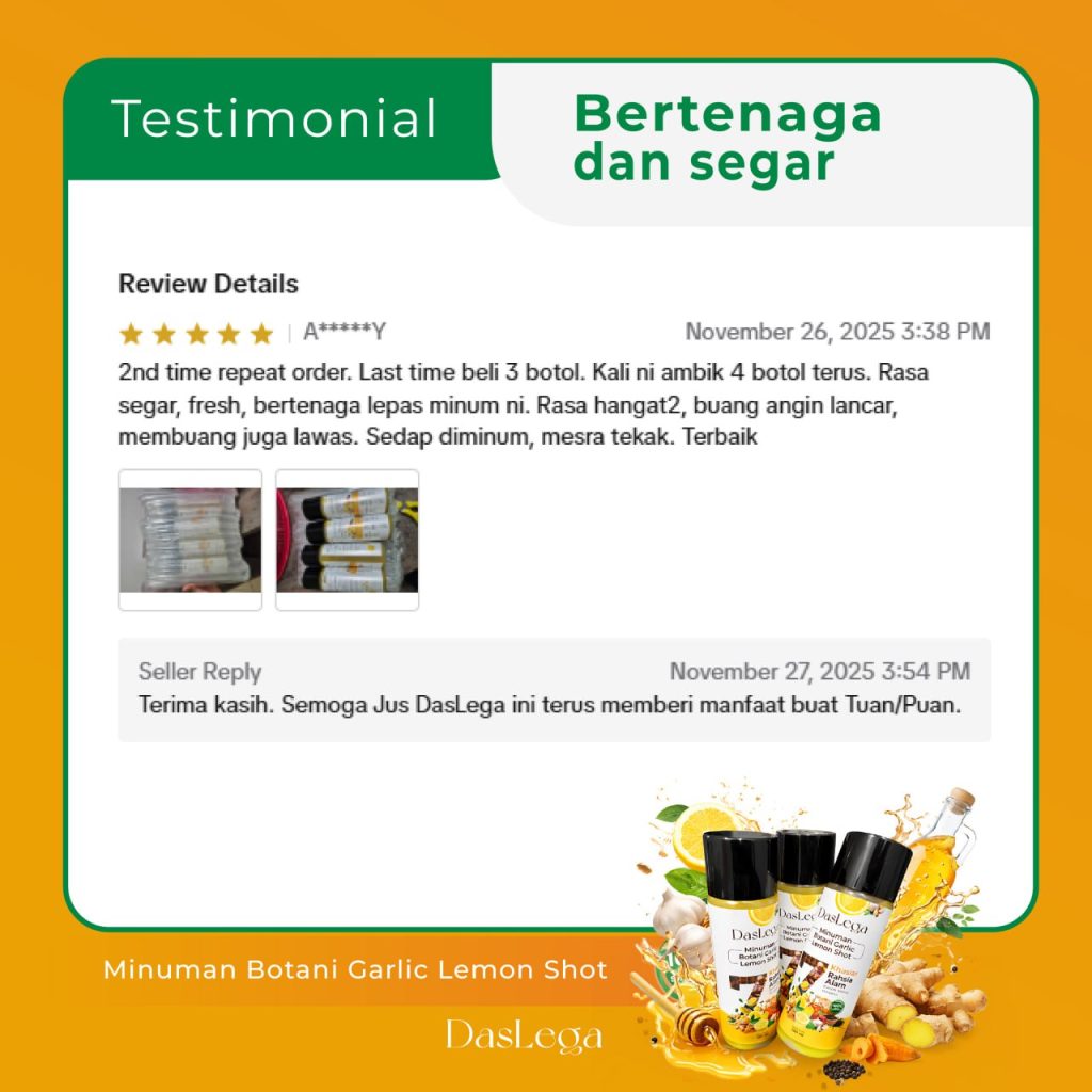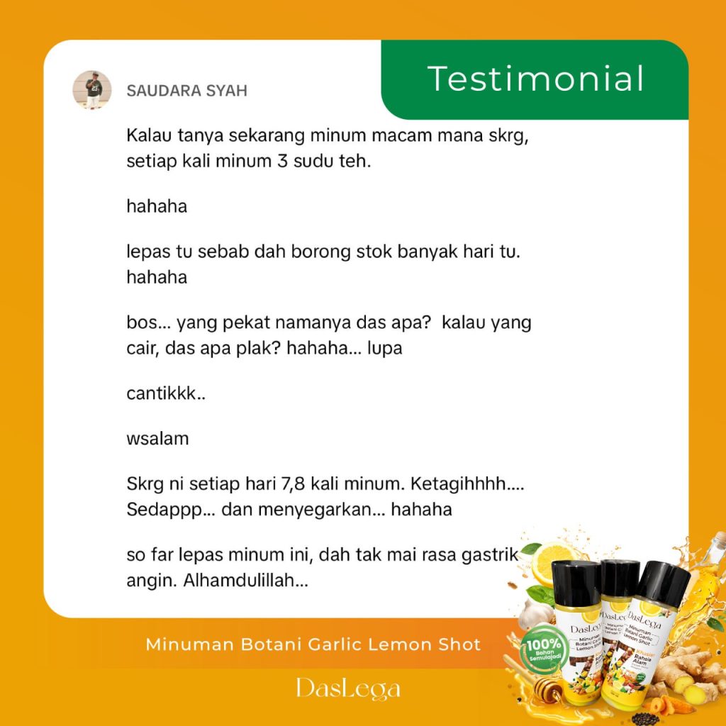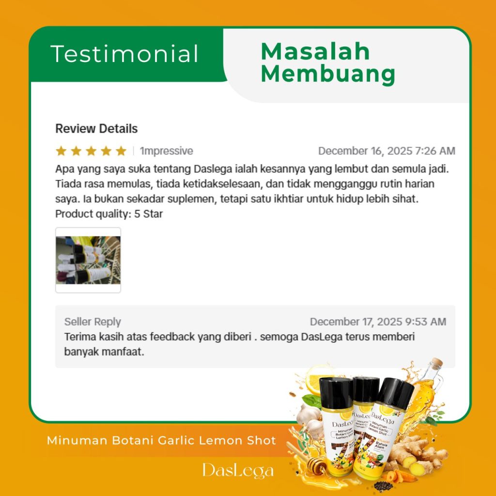 Produk DASLEGA Detox Booster adalah minuman kesihatan berasaskan bahan semula jadi. Ia bukan ubat dan tidak bertujuan untuk mendiagnos, merawat, menyembuhkan atau mencegah sebarang penyakit. Kesan penggunaan mungkin berbeza mengikut individu. Untuk nasihat berkaitan masalah kesihatan atau rawatan perubatan, sila rujuk doktor atau pakar kesihatan bertauliah.