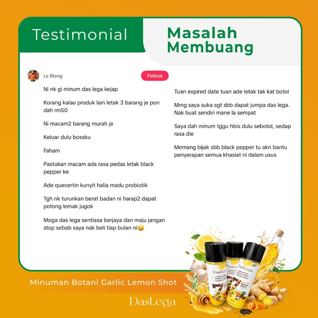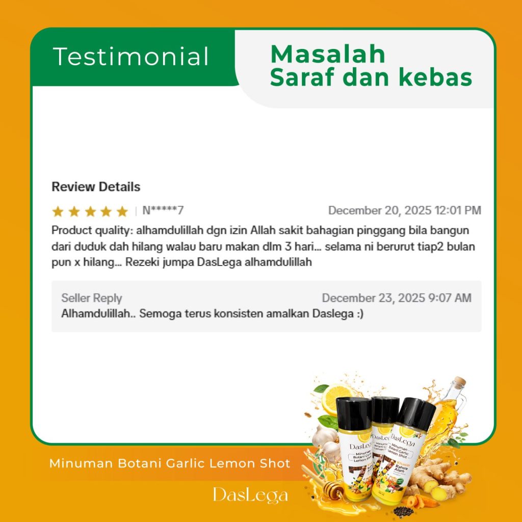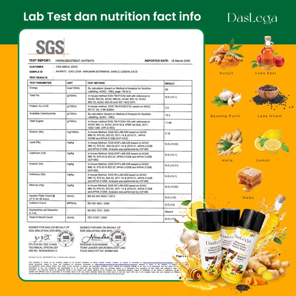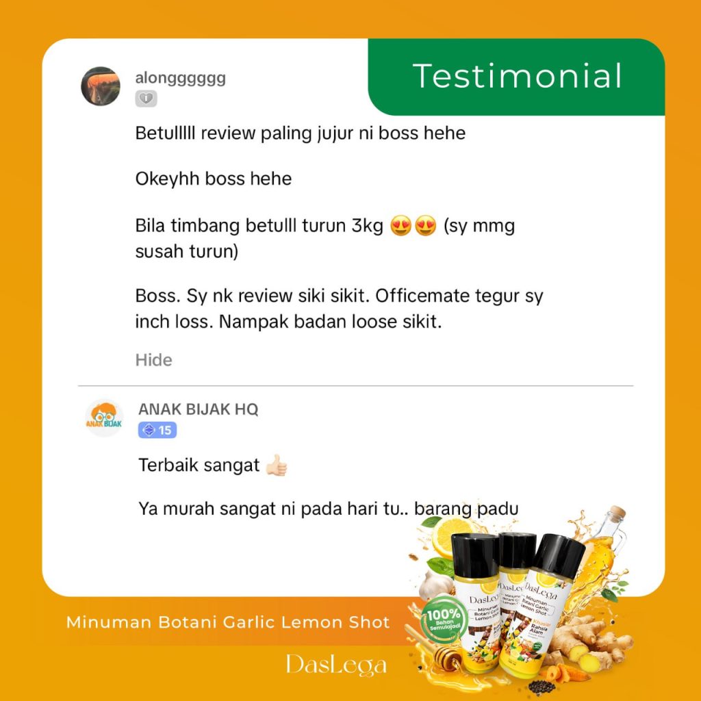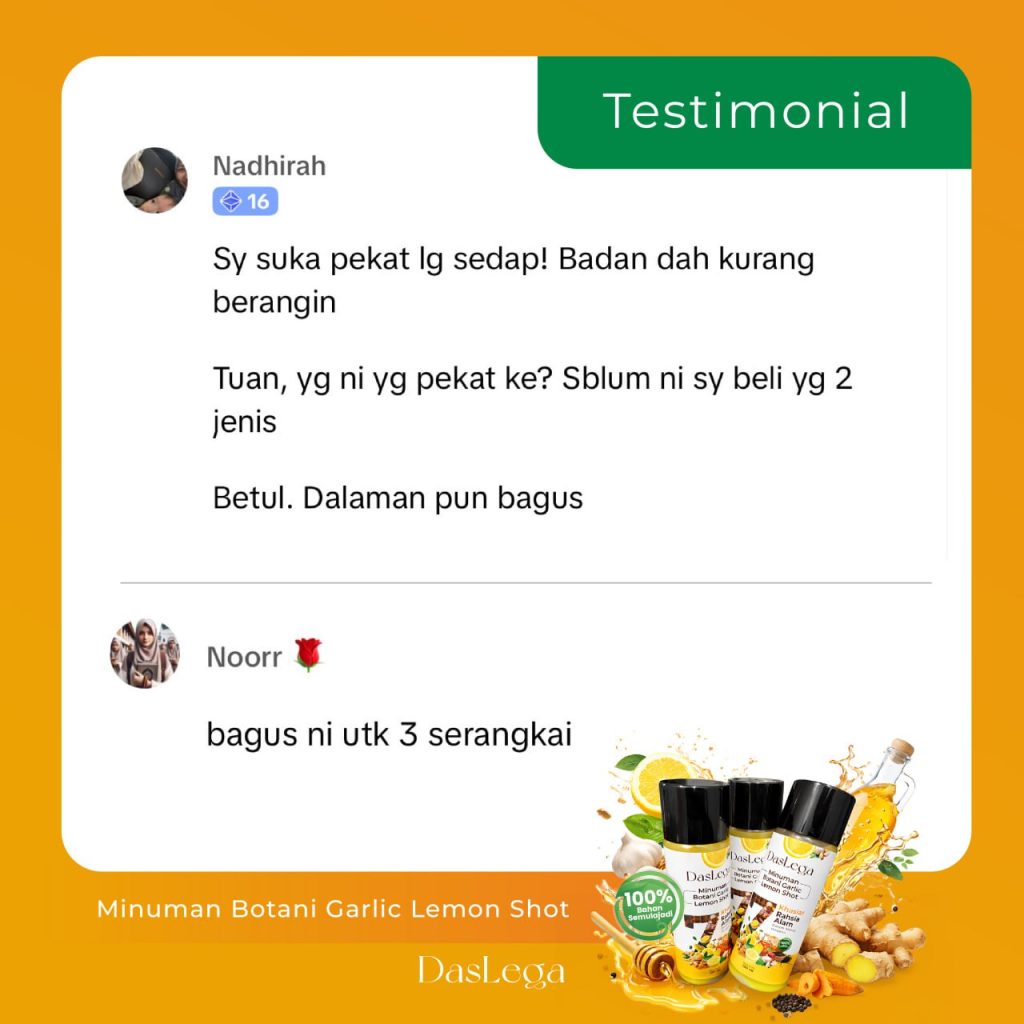 Produk DASLEGA Detox Booster adalah minuman kesihatan berasaskan bahan semula jadi. Ia bukan ubat dan tidak bertujuan untuk mendiagnos, merawat, menyembuhkan atau mencegah sebarang penyakit. Kesan penggunaan mungkin berbeza mengikut individu. Untuk nasihat berkaitan masalah kesihatan atau rawatan perubatan, sila rujuk doktor atau pakar kesihatan bertauliah.